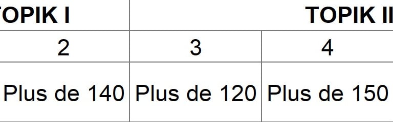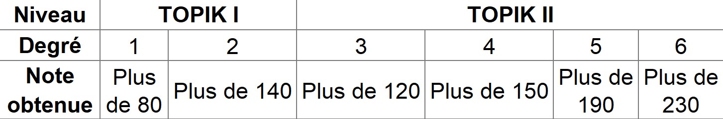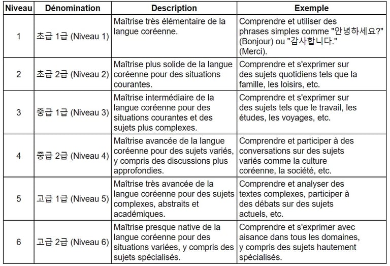 Voici les différents niveaux du TOPIK avec des exemples et une brève description de chaque niveau :
