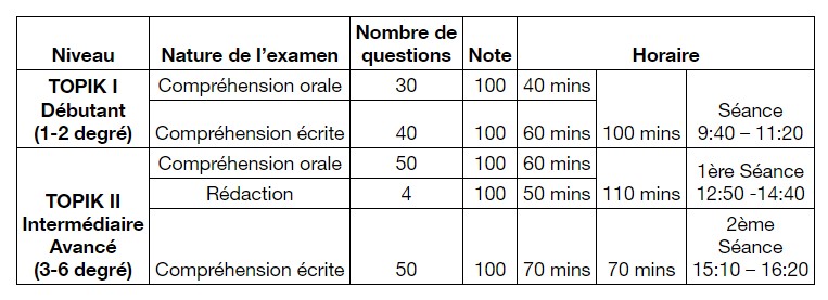 Veuillez trouver plus d'informations sur le site officiel du TOPIK (https://www.topik.go.kr/) ou sur https://topik.educoree.fr/ dédié aux actualités sur le TOPIK.